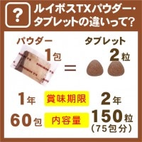 1つめは分量の違い。パウダー1包分の相当量は、タブレット2粒になります(丹羽診療を受診されている患者様で、ドクターから「ルイボスTXを1日3包」と指示されている場合、タブレット6粒となります)。